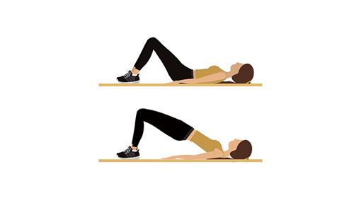 Para este ejercicio, acuรฉstate en el piso con la espalda recta y coloca tus manos a ambos lados de tu cuerpo tal y como lo puedes ver en la imagen ilustrativa. Eleva tu pelvis manteniendo un aposiciรณn recta, y sin tocar el piso con tus glรบteos cuando bajes, solamente al terminar la รบltima repeticiรณn. Realiza 4 series de 10 o 15 repeticiones.